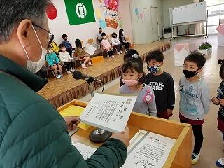 最後に、園長先生からさくらんぼ組さんの一人一人に、可愛い色紙プレゼントされました。